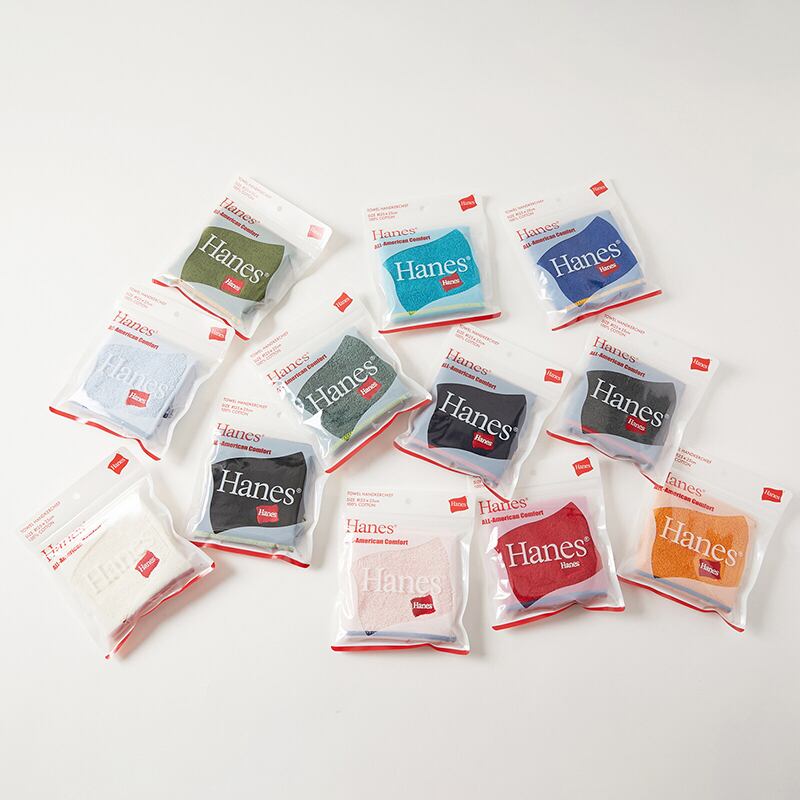 そんなHanes(ヘインズ)の代名詞でもあるパックTシャツをインスパイアした窓枠パッケージと12色のカラーが映えるタオルハンカチです。