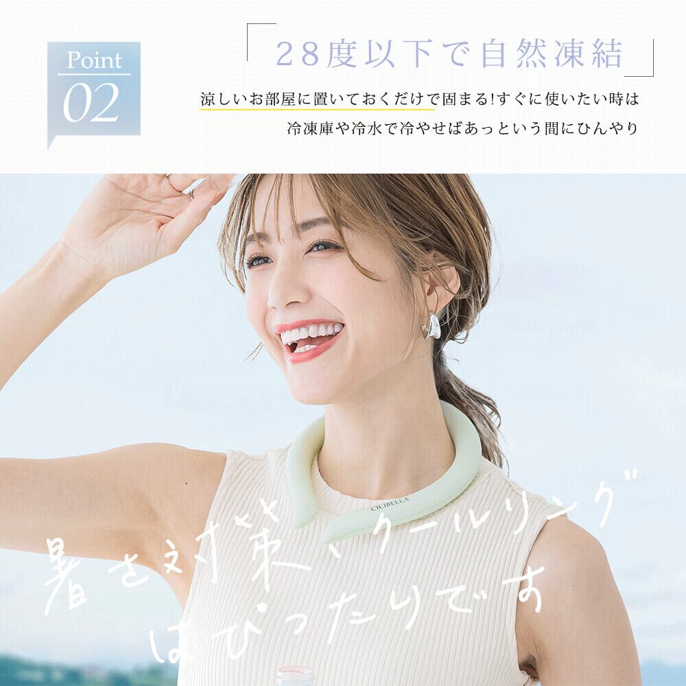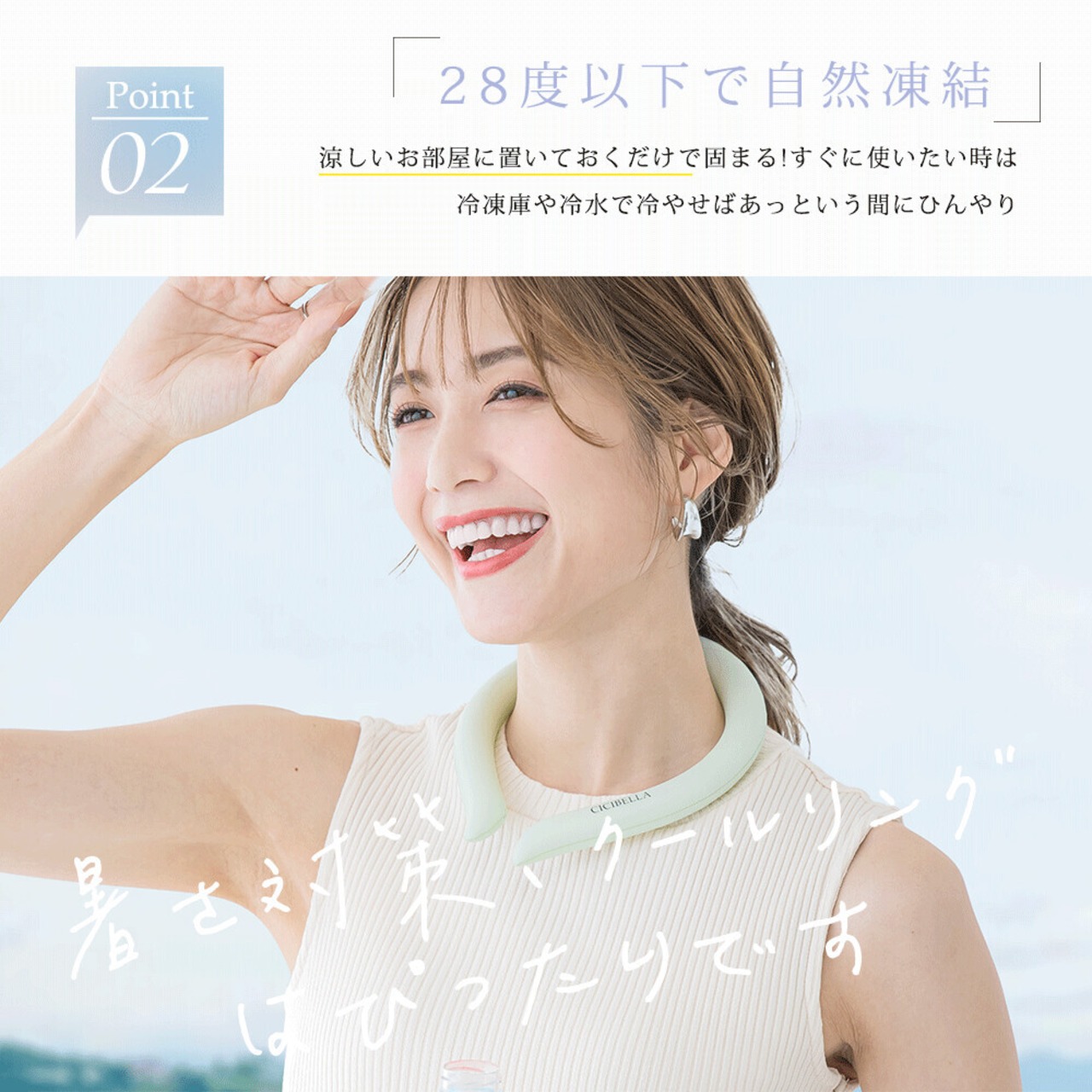 ・暑い真夏の季節でもリングはひんやりキープ!28度以下の空間で凍る不思議な氷「PCM素材」で作られた首元用のネッククーラー。 ・心地良い温度で首の頸動脈を効率的に冷やすので暑さ対策にもオススメ!氷のように冷えすぎないので低温障害の心配もなくお肌にもやさしい♪ ・一度溶けてもエアコンの効いた涼しい空間などに置いておくだけでも再び凍って繰り返し使える!冷凍庫に入れたり水道水に浸けることでさらにスピーディに凍るので急なお出かけにも対応します。 ・首元にフィットして落ちにくいデザイン。スポーツでアクティブに動く方や屋外で作業をする方、通勤・通学時、釣りをする方、家事をする方、ホットフラッシュが気になる方、クーラーのない空間での活動、お風呂上がりや気分転換など様々なシーンでお使いいただけます。